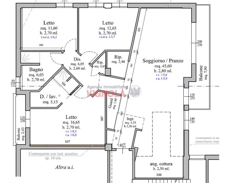 La zona notte, ben separata, comprende tre camere da letto, di cui una con accesso a un secondo balcone, altro ripostiglio e due bagni rifiniti con gres di qualità.