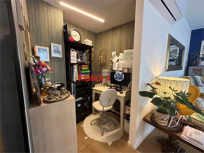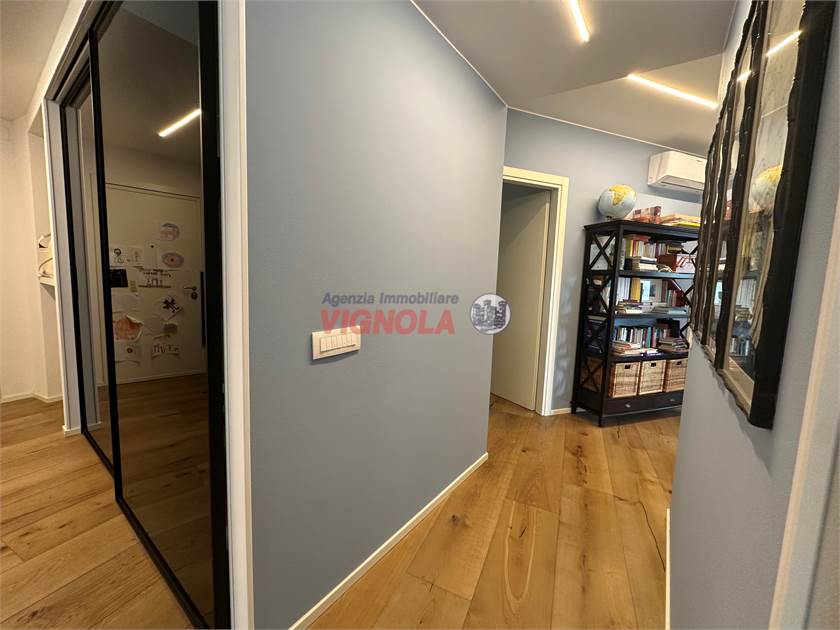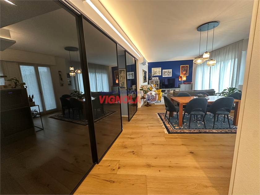 La ristrutturazione ha interessato ogni dettaglio: pavimenti in rovere in tutti gli ambienti, porte rimadesio nella zona giorno, infissi con doppi vetri (alluminio esterno e legno interno), aria condizionata con pompa di calore e tapparelle motorizzate, per il massimo comfort abitativo.